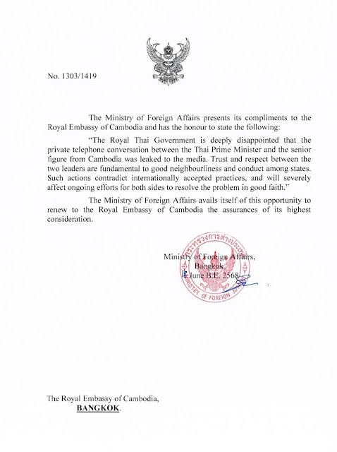 «រដ្ឋាភិបាលថៃមានការខកចិត្តយ៉ាងខ្លាំងដែលការសន្ទនាតាមទូរស័ព្ទលក្ខណៈឯកជន រវាង នាយករដ្ឋមន្ត្រីថៃ និងឥស្សរជនជាន់ខ្ពស់កម្ពុជា ត្រូវបានបែកធ្លាយដល់ ប្រព័ន្ធផ្សព្វផ្សាយ។ ការជឿទុកចិត្ត និងការគោរពគ្នារវាងមេដឹកនាំទាំងពីរ គឺជាមូលដ្ឋានគ្រឹះនៃភាពជាអ្នកជិតខាងល្អ និងការប្រព្រឹត្តល្អក្នុងចំណោមរដ្ឋ។ សកម្មភាពបែបនេះ ផ្ទុយនឹងការអនុវត្ត ដែលអាចទទួលយកបានជាលក្ខណៈអន្តរជាតិ ហើយនឹងប៉ះពាល់យ៉ាងធ្ងន់ធ្ងរដល់កិច្ចខិតខំប្រឹងប្រែងដែលកំពុងបន្តសម្រាប់ភាគីទាំងពីរក្នុងការដោះស្រាយបញ្ហាដោយស្មោះត្រង់» ៕